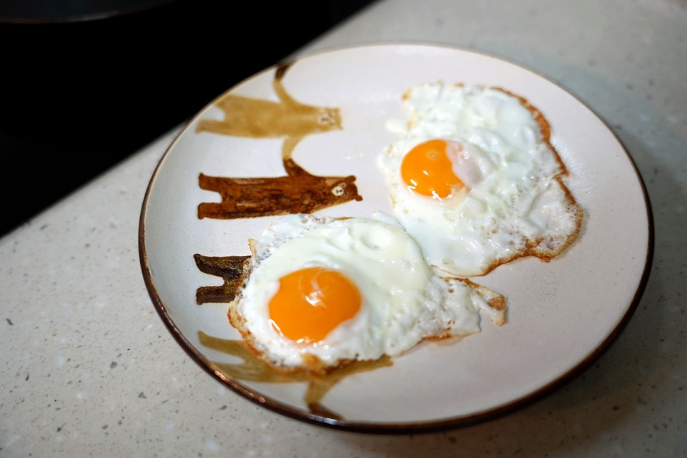 가장자리가 노릇노릇하게 익은 계란후라이 두 마리 대기 중.
