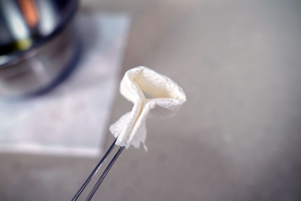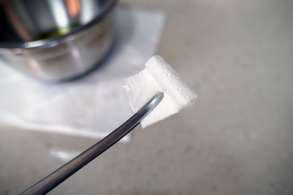2장을 길게 접어 핀셋으로 이렇게 잡고 닦아내고 닦은 면에 기름이 스며든 뒤 다른 깨끗한 면으로 다시 접어 닦으면 여러 장을 사용하지 않아도 돼 낭비를 막을 수 있다.
