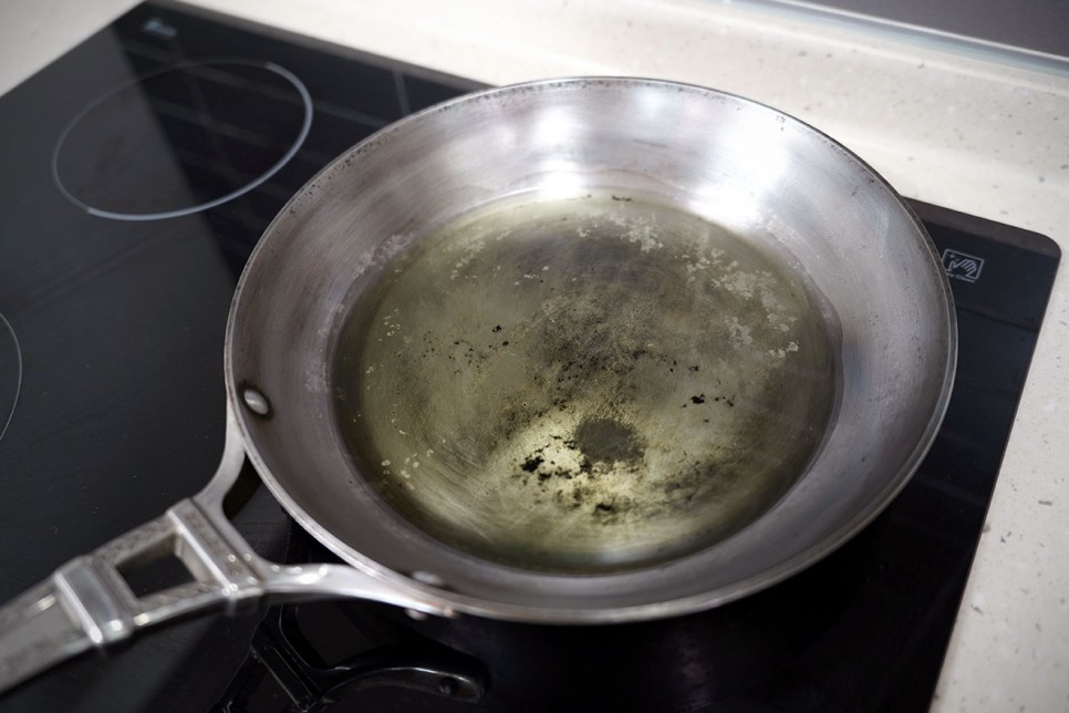 중불로 5분 정도 예열하고 물방울을 프라이팬 위에 뿌렸을 때 물방울이 프라이팬 위에 굴러다니면 불을 끄거나 약한 불로 줄여 기름을 붓는다.