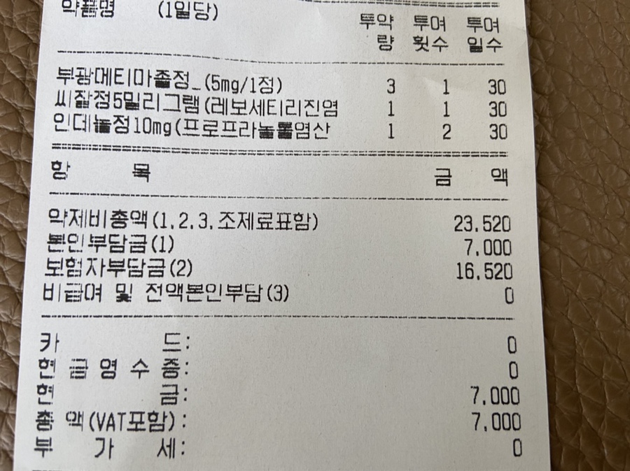 약값 약제비는 23520원, 본인부담금 7000원, 보험자부담금 16520원=7000원