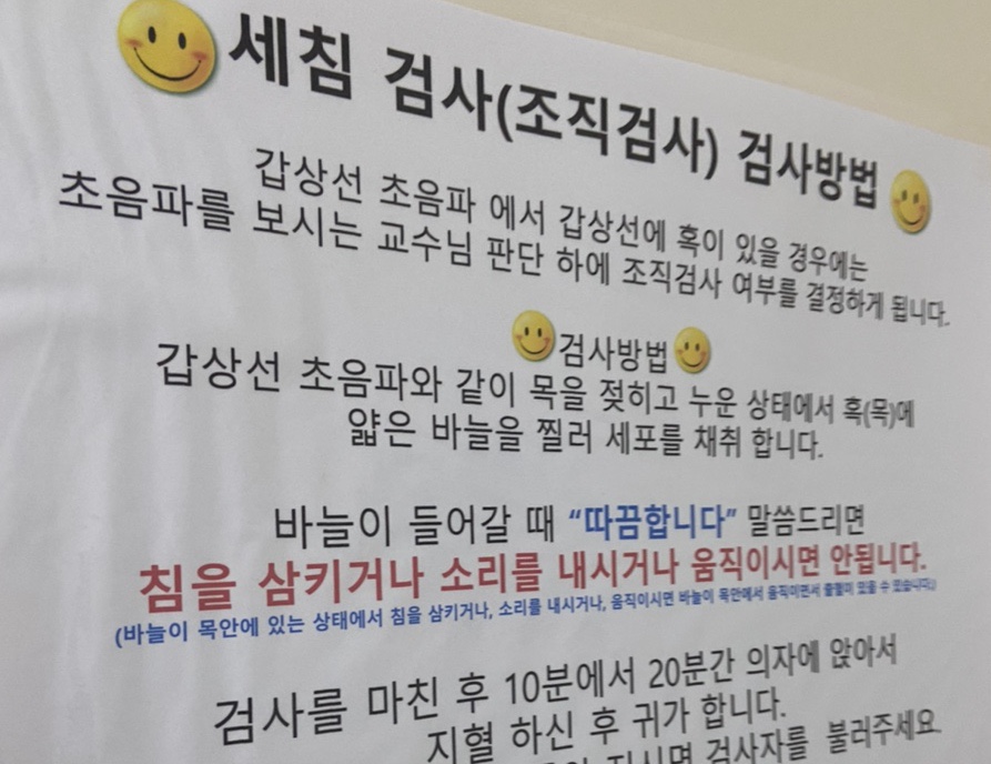 마취크림 바르고 대기 후 바로 실시ㅠㅠ1, 초음파2, 피검사는 또 3, 갑상선 세척검사를 자세히 읽어보니 부들부들 마취크림 후 목에 미세침으로 찔러 세포 꺼내기ㅠㅠ너무 무서워서ㅠㅠ이렇게 밴드를 달아주고 지혈 10분 후 귀가 아프면 진통제를 뿌린다고 병원에 연락을… 세침검사를 할 경우 목 위로 올라오는 것이 없어야 합니다.목이 좀 부어요(울음)