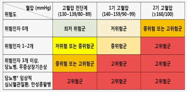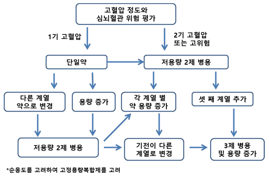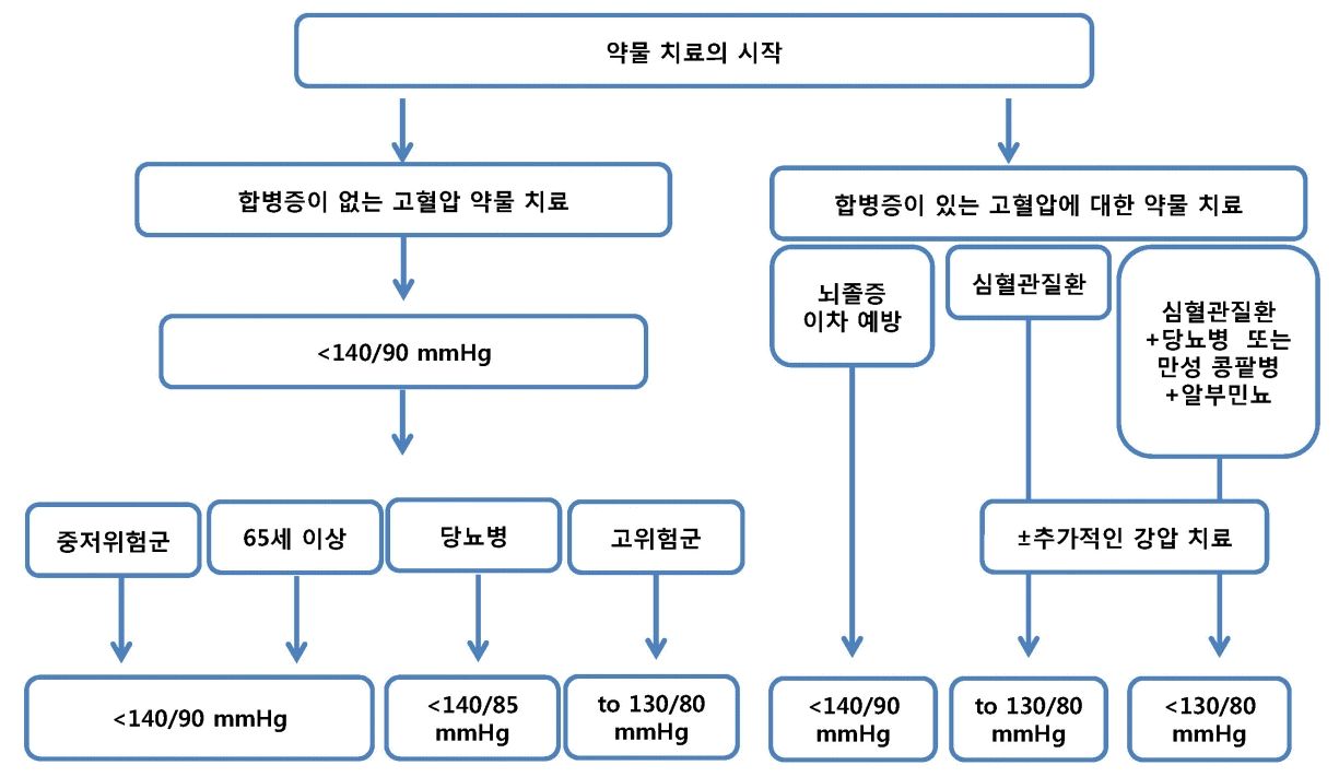 Classification of blood pressure for adults혈압 분류의 수축기 혈압(mmHg)확장기 혈압(mmHg)정상 혈압*<120그리고<80주의 혈압 120-129그리고<80, 고혈압 전 단계 130-139또는 80-89, 고혈압 1기 140-159또는 90-992기 160또는 100여러 축으로 단독 고혈압 140그리고<90*, 심장이나 뇌 혈관 질환 발생 위험이 가장 낮은 최적 혈압. 4. 고혈압 환자의 약물 치료 시작과 목표 혈압, 고혈압으로 진단 받은 환자로 고혈압 치료 효과는 기저 혈압의 높이, 심혈관 위험도, 당뇨병, 만성 신장 병, 연령, 성별과 인종에 무관하다고 보고되고 있지만, 대부분의 임상 연구가 고위험 군 환자를 대상으로 시행된 몸 개별 위험도를 무시하고 모든 고혈압에 대해서 바로 약물 치료를 시작한 것은 적절하다아니다. 그러므로 심장이나 뇌 혈관 질환이 없이 군 있는 환자의 치료의 개시 시점은 다르다.1)고혈압 전 단계, 고혈압 치료를 통해서 심장이나 뇌 혈관 질환을 예방하는 효과가 얼마나 뛰어나도 고혈압 전 단계에서 약물 치료는 권고하지 않는다. 혈압의 심장이나 뇌 혈관 질환 사망률은 115/75 mmHg에서 수축기 혈압이 20 mmHg, 확장기 혈압이 10 mmHg씩 증가함으로써 2배씩 증가한다. 그러므로 혈압이 120/80 mmHg이상이면 고혈압 발생과 심혈관의 사고를 예방하기 위한 적극적 생활 요법을 권고하는[5-7].2), 심혈관 질환이 동반되지 않은 고혈압 환자들에 환자는 일차적으로 혈압을 낮추기 위한 임상 시험에서 도출된 근거에 기초하여 고위험 군은 140/90 mmHg이상이면 모두 약물 치료를 시작해야 한다. 그러나 중위험 군 또는 저위험 군에서는 1기 고혈압 때 약물 치료를 개시하는 것에 대한 임상 근거가 다소 빈약하다. 한국 진료 지침에서는 중국에서 시행된 The Felodipine Event Reduction(FEVER)연구와 중위험 군에서 시행된 Heart Outcomes Prevention Evaluation-3(HOPE-3)연구 결과를 근거로 중위험 군에서는 과거와 달리 처음부터 약물 치료와 생활 요법을 동시에 시행하라고 권고했다[6,8,9]. 다만 저위험 군에서는 2기 고혈압일 때만 바로 약물 치료를 시작할 수 있다. 저위험 군이면서 1기 고혈압 환자는 처음에 생활 요법을 먼저 시행한 뒤 조절되지 않을 때 약물 치료를 시작하도록 권고한다.일차적으로 혈압을 낮추기 위한 목적에 항고 혈압 약을 복용한 환자에서 목표 혈압에 관한 연구는 매우 드물다. Action to Control Cardiovascular Risk in Diabetes(ACCORD)연구에서도 적극적인 강압 치료의 효과를 입증할 수 없었기 때문에 일반적인 고혈압 치료의 목표 혈압은 140/90 mmHg미만인[10]. 최근의 메타 분석에서는 심혈관 질환이 없는 고위험 군 환자를 140/90 mmHg이상의 혈압에서 약물 치료를 시작할 때 혈압을 130 mmHg가까이 낮추는 것이 심혈관 질환에 대한 예방 효과가 가장 뛰어났기 때문에 심혈관 질환이 없는 고위험 군에 대해서 혈압을 130/80 mmHg까지 낮추도록 권고한[5].심혈관 질환을 수반하는 고혈압 환자 항고혈압 약의 종류와 임상 적용 영역을 고려하면 대부분의 심혈관 질환 환자는 혈압이 높아서가 아니라 심혈관 질환 자체를 치료하기 위해서 레닌-앤지오텐신 계통(Renin-Angiotensystem, RAS)차단제나 베타 차단제를 필수적으로 적극적으로 처방하게 되고, 일부 협심증 환자도 증상 조절 목적으로 칼슘 차단제를 복용하게 된다. 마찬가지로 단백뇨를 따른 만성 신장 병 환자도 단백뇨 치료 목적으로 RAS차단제를 복용하게 된다. 그러므로 이런 환자가 항 고혈압제 치료 개시 시점을 논하는 것이 어렵다. 다만 목표혈압에 비춰 혈압을 더 낮출 필요가 있는지 판단하는 것이 혈압치료의 관점에서 중요하다고 할 수 있다.심혈관 질환 환자는 대부분 해당 질환을 치료할 목적으로 항고혈압 약을 복용하기 때문에 초기 상태에서 고혈압이 있었는지 명확하지 않다. 그럼에도 불구하고 혈압이 140mmHg 미만으로 조절되지 않는다면 심혈관질환과 고혈압이 동반된 것으로 봐야 하지만 약제 복용 중 혈압이 140mmHg 미만이면 원래 고혈압이 있었는지는 병력을 참고해야 한다. 심지어 RAS 차단제를 복용하고 있는 심부전 연구에서 베타 차단제의 효과를 본 연구에서는 기저혈압이 130mmHg 미만인 경우도 있다. 따라서 이러한 심혈관 질환 환자에 대한 추가적인 혈압 치료는 이미 필수 약제를 복용하고 있음에도 목표 혈압에 도달하지 못한 환자들을 대상으로 고려할 수 있다(Fig.1-3).