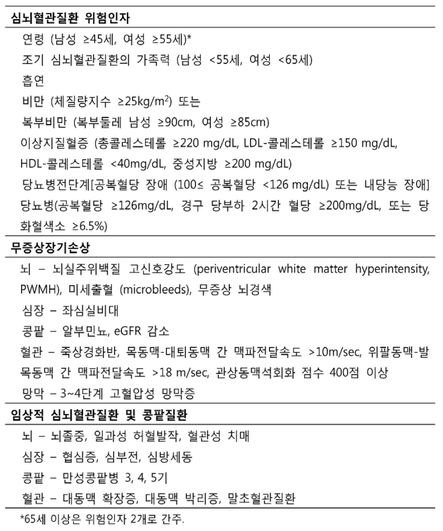 Figure 3.Risk factors of car dio-cerebrovascular disease, asymptomatic organ damage, and comorbidities. 다양한 심혈관 질환을 동반한 환자에 대한 Ettehad등[1]의 메타 분석 결과에 따르면 혈압을 추가로 10 mmHg 줄이는 데 따른 이득이 기본 혈압이 120 mmHg미만의 경우에도 관찰된다는 보고가 있었지만 이 메타 분석은 Systolic Blood Pressure Intervention Trial(SPRINT)연구의 영향이 매우 크고 기저 혈압이 낮은 대부분의 연구가 고혈압을 목적으로 시작한 연구 아닌, 심부전 치료를 목표로 하는 연구니까 일반적인 고혈압 환자에게 적용하는 데는 어려움이 있는[1,11]. 다만 SPRINT연구는 50세이상의 관상 동맥 질환, 말초 혈관 질환, 대동맥 질환, 심부전, 좌심실 비대 환자에 대한 연구로서 진료실 자동 혈압 기준으로 120 mmHg미만, 즉 일반적인 진료실 혈압에서는 130 mmHg정도 혈압을 낮출 140 mmHg정도 혈압을 조절하는 것에 비해서 우월하다는 해석이 가능하고, 심혈관 질환이 동반된 환자는 항고 혈압 약을 시작할 때의 상황과 관계 없이 환자의 혈압에 의해서 추가적인 강압 치료에서 혈압을 130/80 mmHg까지 낮추도록 권고하고 있다[11]. 2018년에 개정된 고혈압 진료 지침도 고 위험 군과 심혈관 질환 환자를 중심으로 목표 혈압을 130/80 mmHg까지 하향 조정함으로써 보다 적극적인 약물 치료를 지지했다.5. 고혈압 1차 치료 고혈압 진단 초기에 2기 고혈압이라고 진단된 경우를 제외하면 고혈압의 약물 치료는 단일 치료제로 시작된다. 한국의 고혈압 치료제 처방 패턴의 변화를 분석한 결과 2002년에는 고혈압 치료자 중 57%가 하나의 계열의 항고 혈압 약을 복용했지만 2016년에는 단일 치료제, 군이 40%로 감소했다. 이를 바탕으로 40-50%의 고혈압 환자에서 단일 치료제를 투여하게 되지만 단일 치료자 중에서는 안지오텐신 수용체 차단제(Angiotensin Receptor blocker, ARB)과 칼슘 차단제가 각각 43%로 가장 많이 처방되는 항고 혈압 약이며 베타 차단제(7%), 이뇨제(4%), 안지오텐신 변환 효소(Angiotensin-Converting Enzyme, ACE)억제제(2%)등은 빈도가 높지 않았다. 이들 약제의 전반적인 특성은 다음과 같다.1)베타 차단제 1964년 James Black이 최초의 베타 차단제인 프로프라놀롤(propranolol)을 개발한 다음 베타 차단제는 1977년 미국 고혈압 지침에서(Joint National Committee, JNC I), 고혈압 치료 1차 약제로 사용되어 왔다. 그러나 베타 차단제는 뇌 중풍 예방 효과와 좌심실 비대의 감소 효과가 다른 고혈압 약에 비해서 떨어지고, 당뇨 발생률을 증가시키는 다양한 연구가 발표되면서 미국 고혈압 지침과 일본의 고혈압 지침에서는 고혈압 치료 1차 약제로 제외됐다. 다만 유럽과 한국의 고혈압의 지침에서는 1차 고혈압 약으로 여전히 권고되고 있다[12-14]. 베타 차단제가 다른 약에 비해서 떨어진 결과를 나타낸 기전으로 베타 차단제의 심궁스 축력 억제와 이로써 혈관 수축의 증가로 만성 고혈압의 특징인 말초 혈관 저항을 오히려 증가시킨다는 점인데, the Conduit Artery Function Evaluation(CAFE)연구에서 이 놀이부터(atenolol)상완 동맥 혈압의 감소 효과는 암로디핀(amlodipine)와 차이를 보이지 않았지만 중심 동멕아프은 오히려 증가하고, 말초 혈관 저항 증가가 뇌 중풍 발생률 증가와 관련성이 있음을 시사했다[15]. 또 혈관 수축의 증가는 근육 조직과 같은 말초 조직의 혈류를 감소시키고 지방 대사, 당대의 회사에 악영향을 주고 이는 결국 내피 기능 장애와 당뇨병을 유발할 수 있다. 그러나 이런 연구는 거의 전통적인 베타 차단제를 대상으로 한 연구로서 혈관 확장 작용을 가진 3세대 베타 차단제는 과거의 연구와 다른 효과를 가져올 가능성이 있어 실제 소규모 연구에서 당뇨병의 발생에 부정적 영향은 없다고 보고되고 있지만 아직 심장 혈관 합병증에 대해서 직접 보고한 연구는 없다.베타 차단제가 다양한 한계는 있지만 협심증이나 심근 경색증 같은 허혈 심장 질환을 가진 고혈압 환자가 여전히 중요한 항고 혈압 약으로서의 역할을 하고 있다. 또 심부전, 심방 세동, 빈맥 아버지 정맥, 60세 이하 젊은 나이 또 임신을 준비 중인 젊은 여자로부터 권고되고 있어 bisoprolol, metoprolol succinate, carvedilol은 좌심실 부전이 있는 고혈압 환자에게 특히 유용하다[16]. Atenol은 뇌 중풍 발생의 예방 효과가 떨어지고 있으므로, 노인에게는 1차 약제로서는 추천되지 않았다. 또 혈당 이상과 지방 대사 장애를 가져올 수 있다, 혈당 이상, 당뇨, 웰빙 신드롬으로는 주의가 필요하다.천식, 만성 페삿크성 폐 질환 심한 빈맥 환자가 주의해서 사용해야 하고, 말초 혈관 질환 환자와 이형 협심증 환자가 증상을 악화시킨다는 보고가 있다. 베타 차단제와 이뇨제의 병합은 혈압 강하 효과가 떨어지지 않지만 당뇨를 악화시킨다는 보고가 있고 당뇨병 발생 위험도가 높은 환자는 특별한 이유가 없는 한 추천하지 않는다. 베타 차단제를 장기간 사용하고 갑자기 투여를 중단하면 혈압이 급격히 상승하는 일이 있으므로, 수주일 동안 천천히 용량을 줄이는 주의가 필요하다[13,14]. 2)레닌-앤지오텐신-알도스테론 계통(reninangiotensin aldosterone system, RAAS)억제제 RAAS는 심장, 신장, 뇌 및 혈관 등 다양한 인체 조직에도 분포하며 온몸에 작용하고 전해
