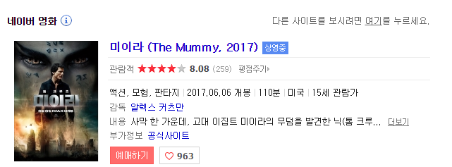 미라(Mummy 2017) 모험.공포 원래 우리가 잘 알던 1990년대 미라 시리즈와는 전혀 다른 이야기의 미라가 탄생했습니다.처음 접할 때 당연히 미라 시리즈를 상상하면서 보지 뭐야.아낙사 아니었어? 하면서 웃었던 기억이 있어요.그만큼 저희한테는 [미이라=아낙수남녀=이모텝]이 공식처럼 기억이 되는데 사실 또 아낙수남녀가 나왔다면 당연히 뭐야 또 아낙수남녀라고 했을 수도 있습니다.