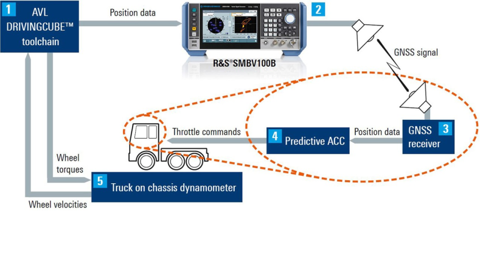 전송된 물리적 트럭의 이동 기반으로 트럭에서 가상 트럭의 위치가 업데이트됩니다. 그 후 이 위치데이터가 R&S®SMBV100B(2)로 전송되며, 이 기기에서 해당 GNSS 신호가 생성됩니다. GNSS 신호가 물리적 트랙의 GNSS 수신기(3)로 공급되며, GNSS 수신기는 수정된 위치를 계산한 후 ACC 기능이 작동 전략을 적절히 조정하도록 합니다.