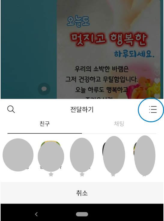 그러면 위와 같이 친구가 나옵니다. 선택해줍니다. 그런데 한 번에 한 명밖에 선택을 못하네요? 한명을고르면이제한명이없어서한번에한명밖에못보내는거죠?그래서위오른쪽에보면줄이세개인메뉴가있어요. 이 버튼을 누르면 돼요.