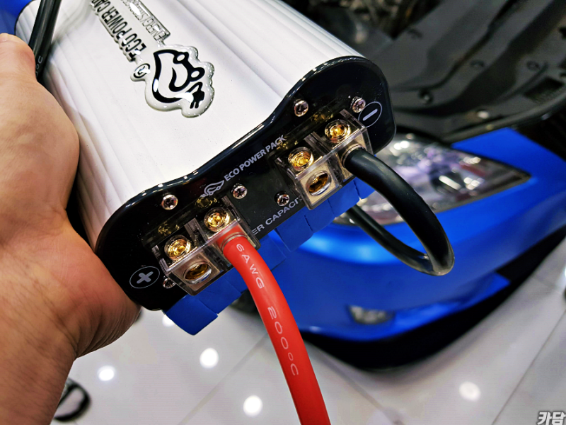 에코 파워 캡은 메인 배터리와 직결 연결하여 가까운 위치에 시공해야 합니다. 캡의 여유 단자에는 블랙박스의 보조 배터리 플러스 마이너스를 채결합니다.
