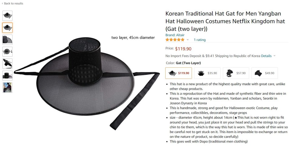 그중에서도 큰 주목을 받은 것은 ‘갓’입니다. 외국인은 트위터 등 네티즌 소통망(SNS)을 통해 <킹덤> 초안을 한 인물을 캡처한 장면을 보고 다양한 소감을 쏟아내기도 했는데요. “조선의 역사와 갓에 대해 좀 더 알고 싶어졌다”고 관심을 표현하기도 했습니다. 이처럼 ‘갓’ 열풍이 분 뒤 누리커뮤니케이션망(SNS)과 구글에는 ‘킹덤핫’이 연관 검색어로 등장했고, 현재 아마존 사이트에서는 실제로 갓을 판매하기도 합니다.