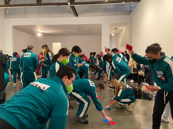 [▲뉴욕 맨해튼에서 미국인들이 꼬리표를 달고 있는 모습 <한국관광공사 뉴욕지사> 행사를 신청한 미국인 80명은 뉴욕 맨해튼 실내 행사장인 ‘스튜디오 525’에서 <오징어 게임>에 등장하는 ‘무궁화 꽃이 피었습니다’, ‘달고나’, ‘레테르’ 등의 놀이를 드라마처럼 서바이벌식으로 체험했고 관광공사는 드라마 속 게임 진행요원을 연상시키는 복장의 행사 인력을 배치해 게임의 흥을 돋웠습니다.