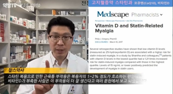스타틴 복용으로 인한 근육통의 부작용은 복용자의 1~2% 정도가 호소하는 편입니다.비타민D가 부족한 사람은 이 부작용이 더 잘 생긴다고 여러 문헌에서 보고되고 있습니다.그래서 비타민 D를 보충하는 것이 이득이라고 결론짓고 있습니다. 왜냐하면 한국인들은 대부분 비타민 D가 부족합니다.