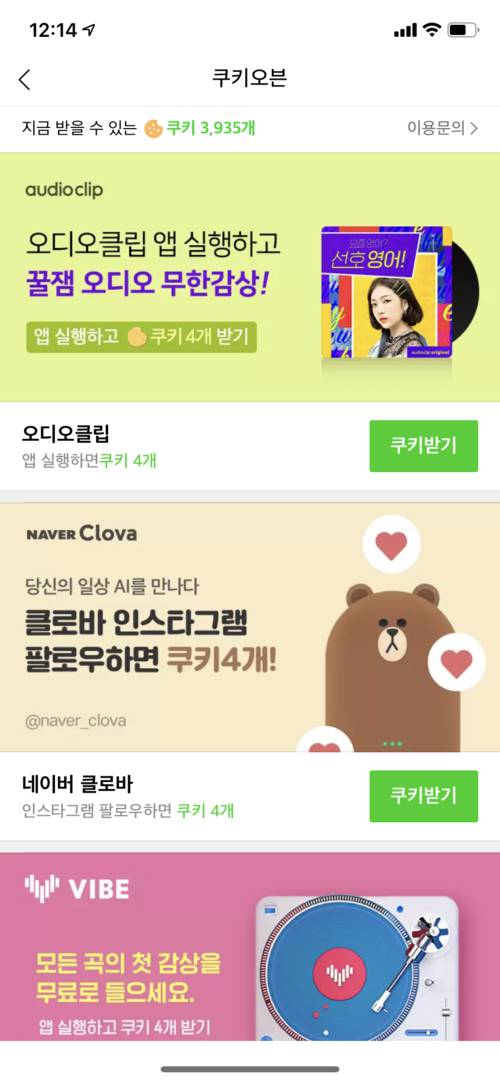 이 오븐에서는 무료 쿠키를 받을 수 있는 다양한 제휴처가 목록에 표시됩니다. 앱을 실행하거나 인스타그램을 팔로우하거나 특정 미션(결제, 음원 감상 등)을 실행하면 쿠키를 지급한다고 배너로 알려드립니다. 이 배너를 클릭하여 상세정보 페이지로 이동합니다.
