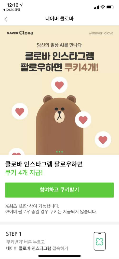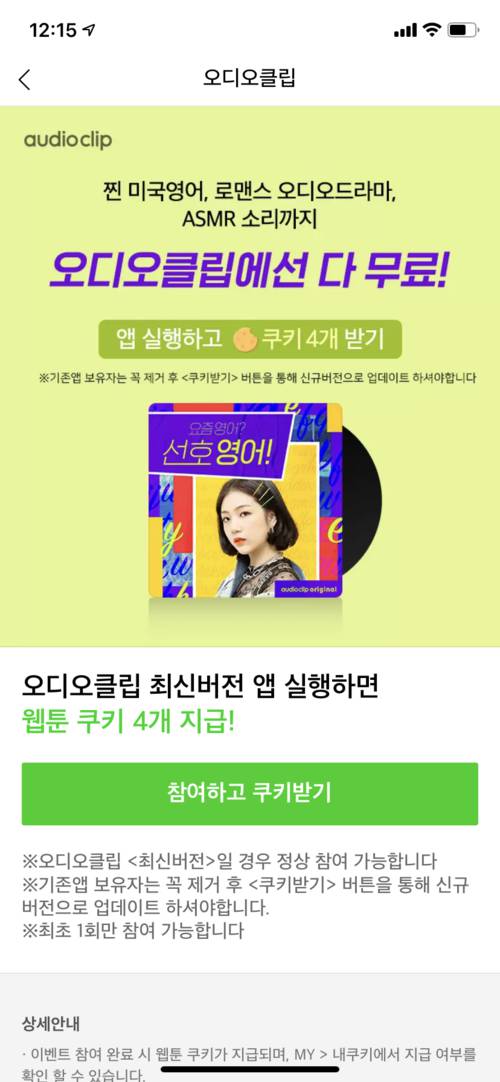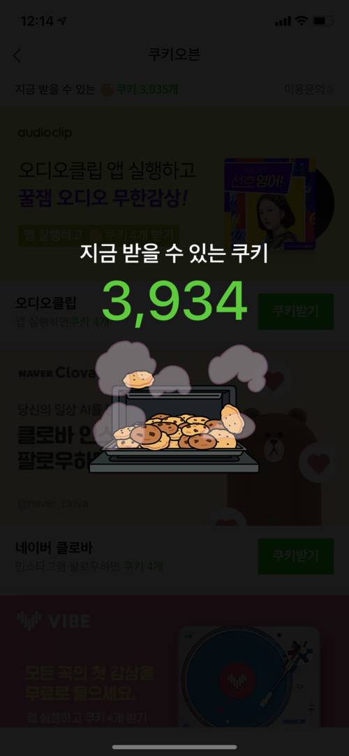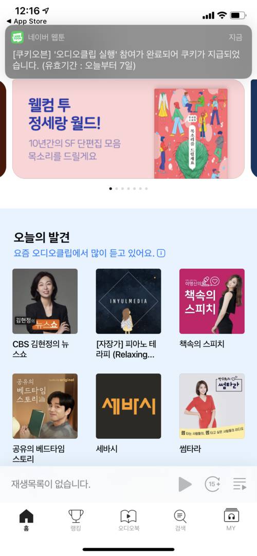 저 같은 경우 ‘오디오클립’이라는 앱을 다운받아 실행하는 미션에 먼저 참여해보았습니다. 앱스토어에서 해당 앱을 받아 실행하면 바로 ‘네이버 웹툰’ 앱에서 쿠키가 지급됐다는 알림을 받았습니다. 이후 쿠키샵으로 이동하면 적립된 내역과 현재 소유량을 바로 확인할 수 있었습니다.