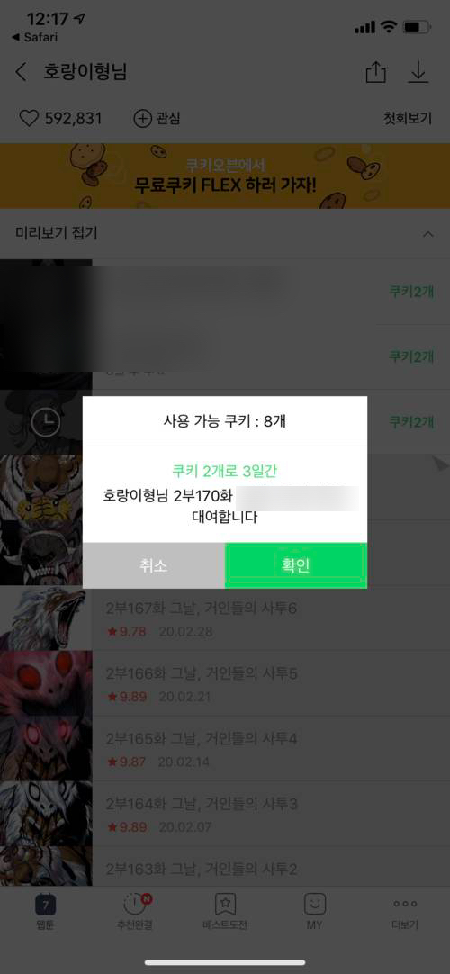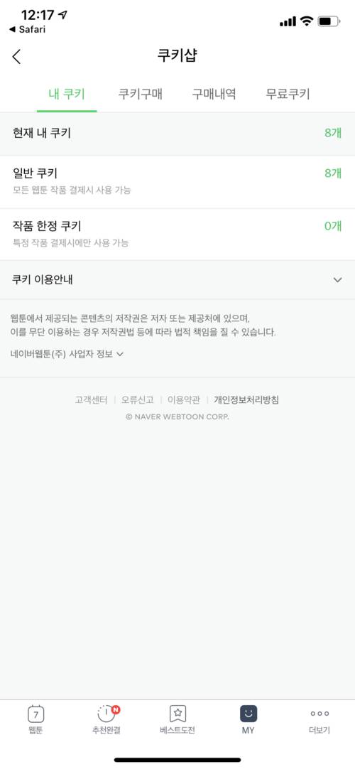 예전에는 이런 ‘프리뷰’ 콘텐츠를 열람하기 위해 아이폰 인 앱 결제를 통해 1200원씩 결제하기도 했는데요. 미리보기 콘텐츠는 ‘쿠키’라는 네이버 웹툰 자체 화폐를 이용합니다. 이는 인앱 결제 및 네이버페이를 통해 충전할 수 있습니다.