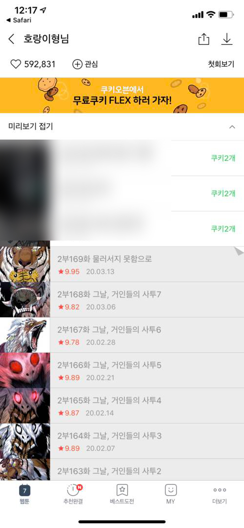 지난해까지 ‘가우스전자’가 연재할 때는 매일 밤 네이버 웹툰 앱을 보곤 했는데요. 최근 몇 주 동안 앱을 켜지 않았는데 어젯밤 오랜만에 들어와서 좀 정주행했습니다. 다음 주 휴재 소식이 올라온 ‘호랑이 오빠’ 프리뷰 3편까지요.
