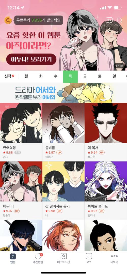 졸리지 않으면 넷플릭스 앱을 켜곤 하는데 최근 위처, 나르코스:멕시코, 킹덤을 잇따라 봐서 오랜만에 네이버 웹툰 앱을 실행해봤습니다.
