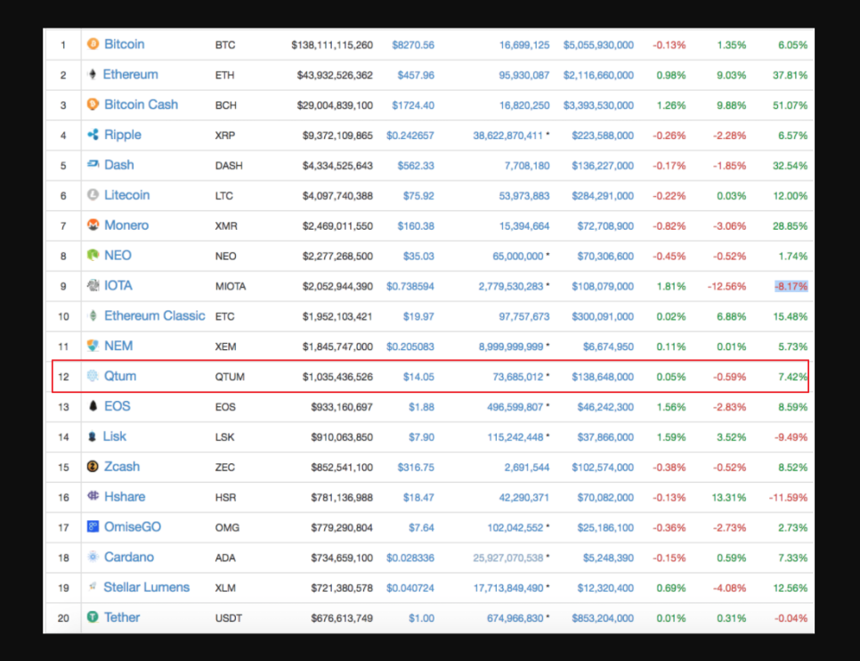 2017년 시가총액 기준 코인 순위, 2017년 시가총액 순위만 따져도 12위에 랭크될 정도로 중국의 이더리움, 인공위성과 같은 다양한 이슈로 미래가 유망한 동전 중 하나였다. 당시 가격은 우리 돈으로 약 16,000원. 현재 시가총액 12위 동전은 ‘Terra(테라)’이다.