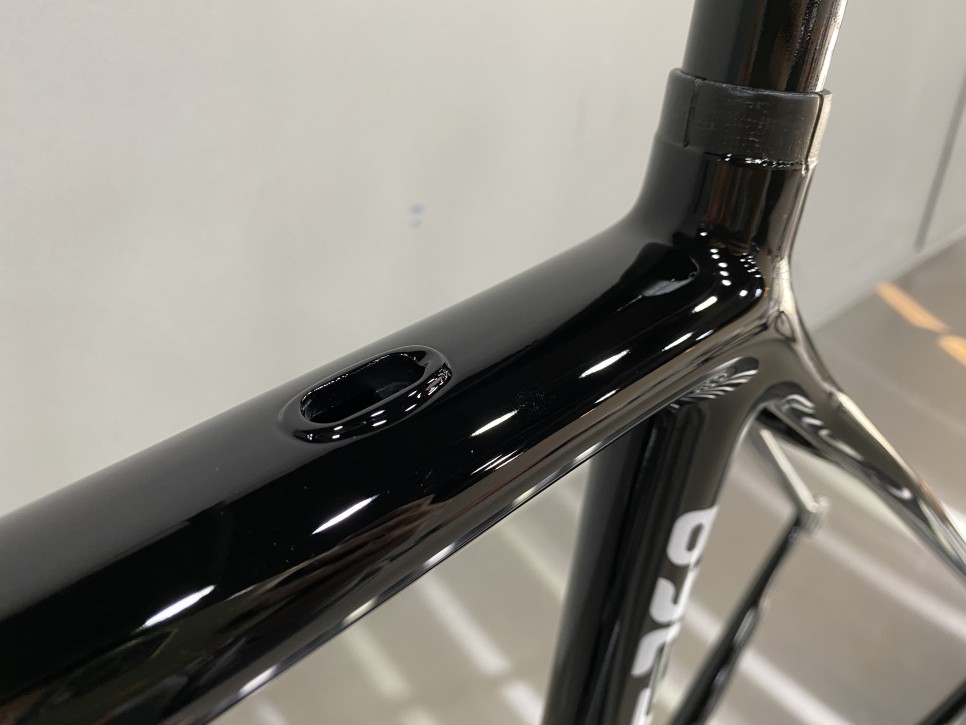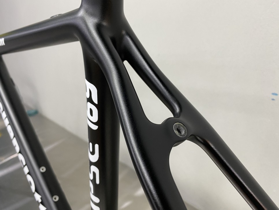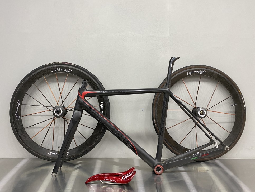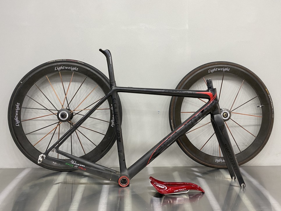 실물로 처음 보는 크루초티에크립스 769와 라이트웨이트 오베마이어의 초기 휠세트는 특유의 클래식한 감성이 고스란히 묻어난다.거기에 레드가 포인트인 데칼에 맞춰 자전거 안장이 SELLESMP의 풀카본 레드 컬러에 맞춰져 있어 완벽한 조합을 이루고 있습니다.