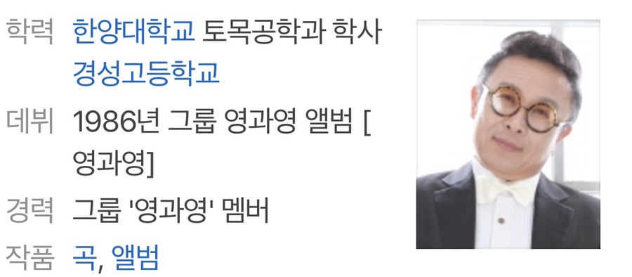 아버지 작곡가 김정호 작곡가 가수 데뷔 1986년 그룹영과영 앨범 [영과영] 사이트 페이스북 경력사항 징코리아 대표 광룡기획 대표 그룹 ‘영과영’ 멤버 학력사항~ 1986 한양대학교 토목공학과 학사~1978 경성고등학교