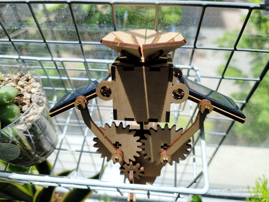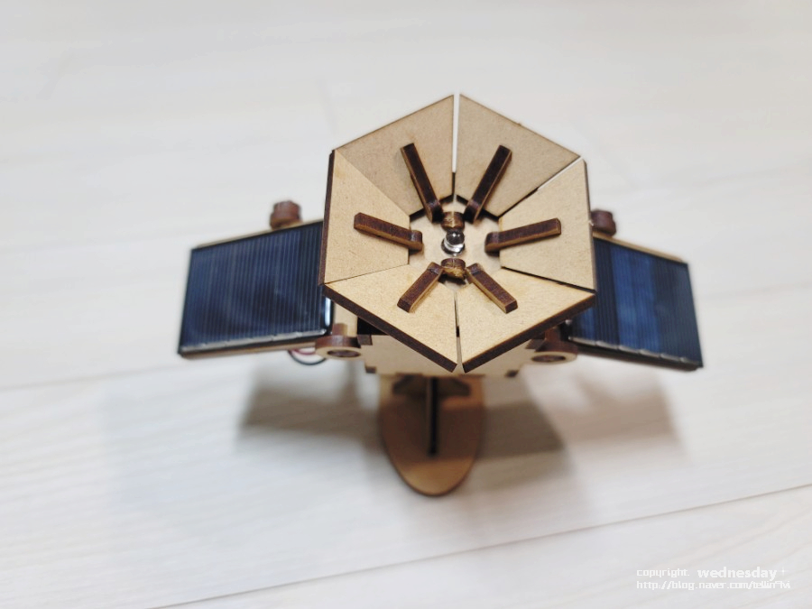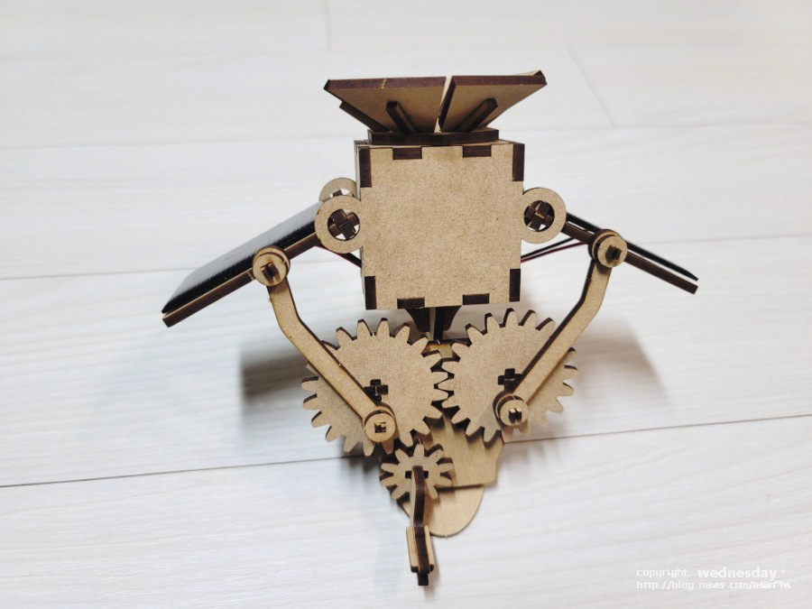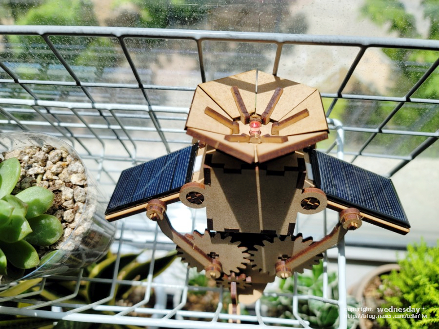 이렇게 완성! 하필 밤에 시작했으니 12시 넘어서 끝난 작업(울음) 손잡이를 돌리면 저 톱니바퀴 같은 게 맞물려 태양전지판이 위아래로 움직인다.각도 조절 용도기어의 원리를 이해하는 데 도움이 된다고.