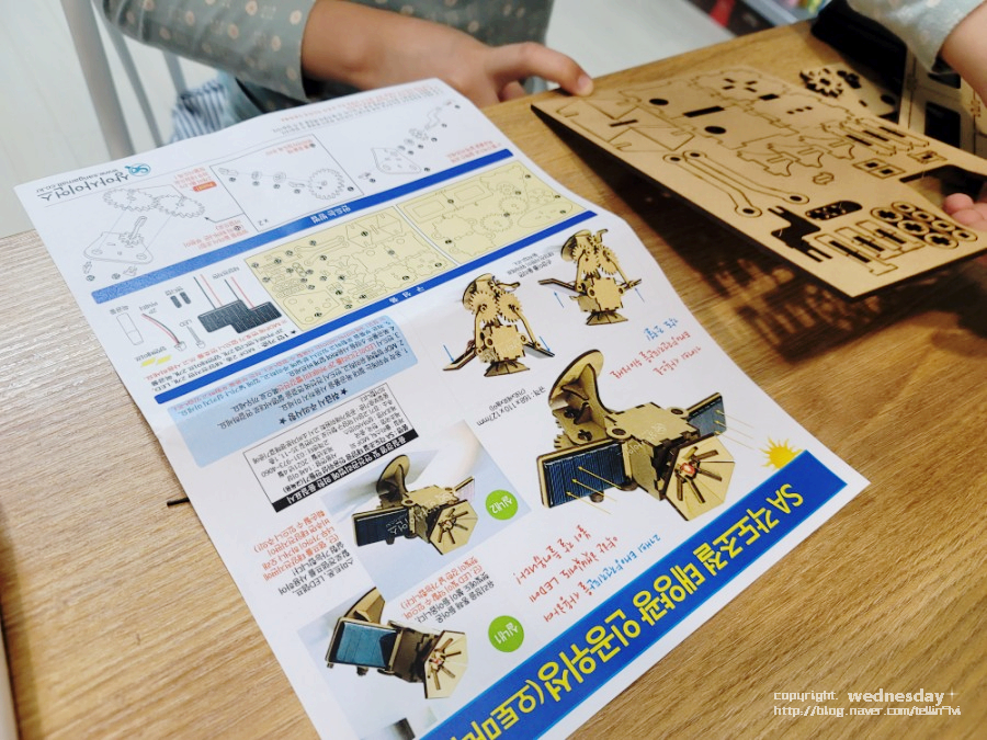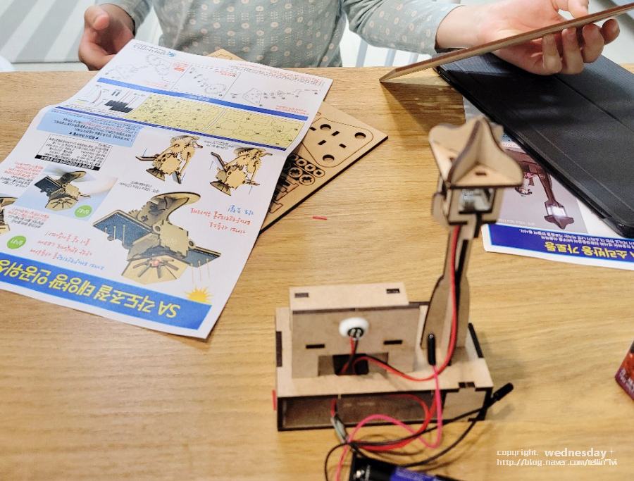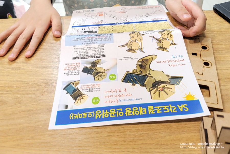 소리반응 가로등을 만든 것을 앞에 두고 태양광 인공위성을 만들기 전에 설명서와 구성품을 본다.