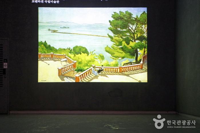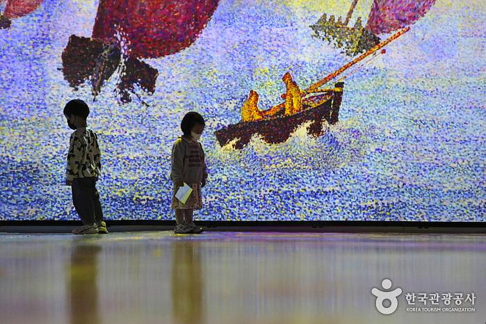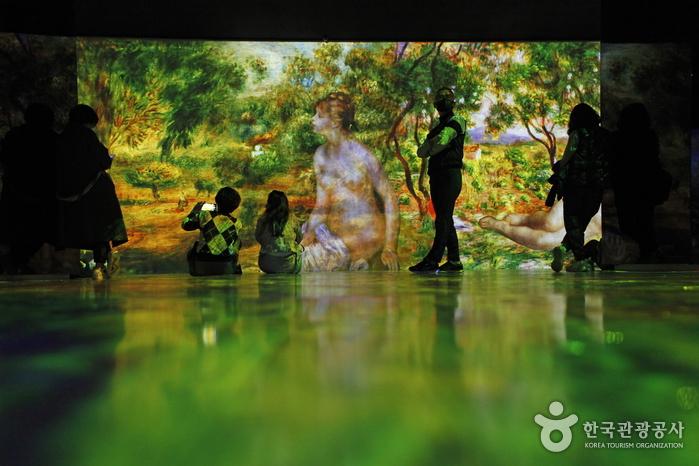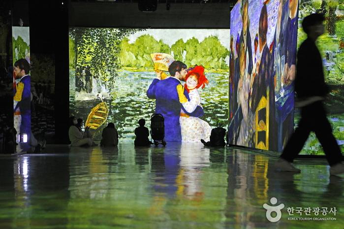 현재는 르누아르와 모네, 샤갈, 크레 등의 작품을 미디어 아트로 전시하고 있습니다. 모네의 ‘수련’, ‘양산을 쓰고 오른쪽으로 몸을 돌린 여자’, 샤갈의 ‘율리시즈의 메시지’ 등 예술가 20명의 작품이 약 35분간 펼쳐집니다.