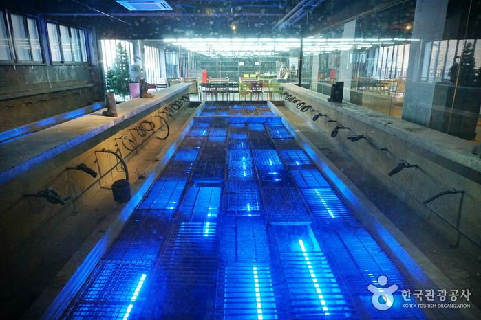 2층에서 1층으로 이어지는 마인갤러리는 탄광시설이 작가의 손을 거쳐 다시 태어난 전시공간입니다. 광부 3000여명이 3교대로 이용하던 샤워실은 몇 개의 오브제와 그림을 더해 독특한 전시실이 됐고, 작업용 장화를 빨던 세화장은 다양한 격자무늬 발판 아래에 조명을 켜 거대한 설치 작품으로 거듭났습니다.