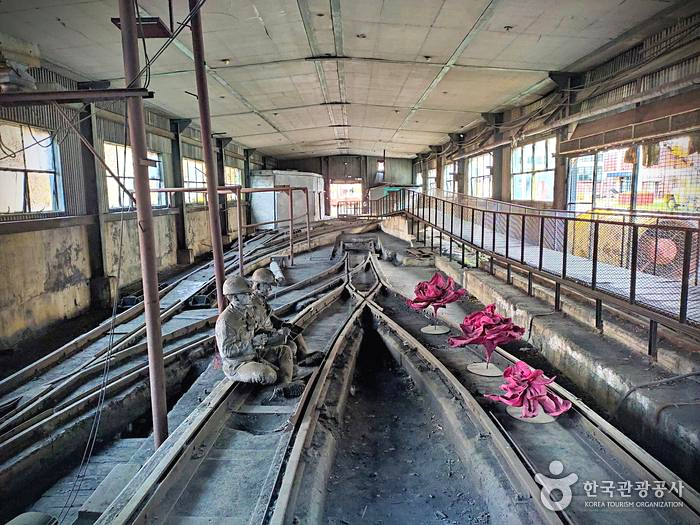 건물 밖으로 나가면 넓은 마당에 몇 개의 조형물이 들어간 ‘기억의 정원’입니다. 연탄으로 쌓은 탑, 광부의 실루엣을 담은 철근 작품, 석탄을 실어 나른 탄차 등이 옛 기억을 간직하고 있습니다.위치 : 강원도 정선군 고한읍 함백산로 1445-44 영업시간 : 09:30~17:00, 월·화휴업 이용요금 : 1인 입장권 10,000원 강원도 정선군 고한읍 함백산로 1445-44