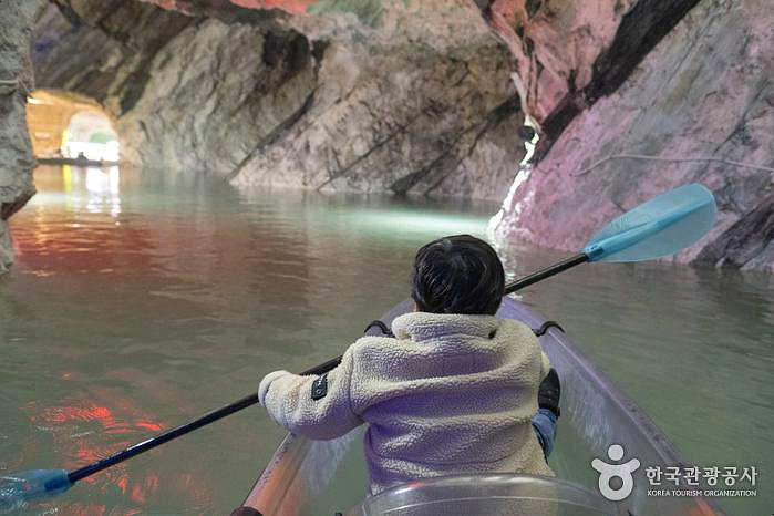 활옥동굴 여행의 하이라이트는 암반수가 고여 생긴 호수입니다. 동굴 안에 호수가 있다는 것만으로도 신비로운데 맑은 물에 사는 은어와 황금송어가 수영을 하다니 놀랍습니다. 즐거운 체험도 할 수 있습니다. 2~3인용 투명 카약을 타고 천천히 동굴을 유람하다니! 카약을 타기 위해 이곳에 온다고 해도 과언이 아닙니다.