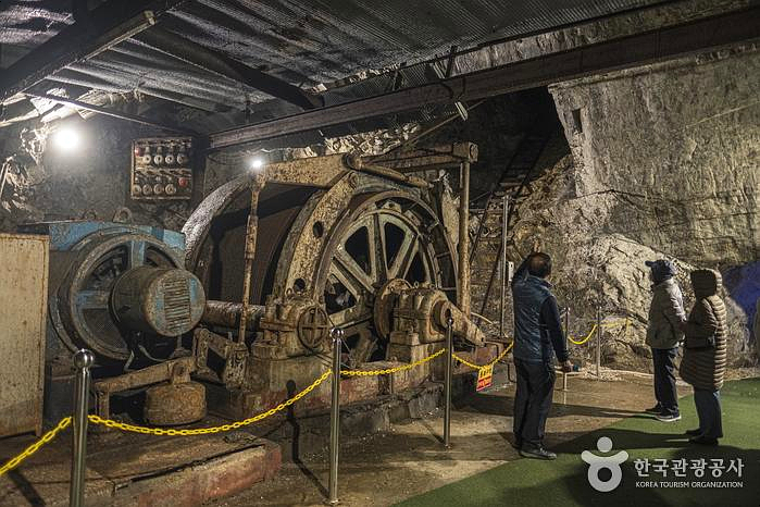동굴 관람 코스를 따라가면 엄청나게 큰 기계를 만나게 됩니다. 미래세계를 다룬 애니메이션에 등장하는 기계장치처럼 보이는 이것은 권양기입니다. 발파하여 채굴한 활석과 백옥을 깊은 갱도에서 운반하던 기계인데, 원통형 몸체에 철선을 감아 물건을 끌어 올립니다. 동굴의 지하 높이는 711m에 달해서 권양기가 필요했다고 합니다.