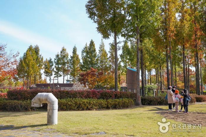 선유도 공원의 인기 포토존으로 꼽히는 녹색 기둥 정원은 규칙적으로 배치된 콘크리트 기둥을 감은 담쟁이들이 계절마다 다채로운 색깔의 생명력을 더해줍니다.