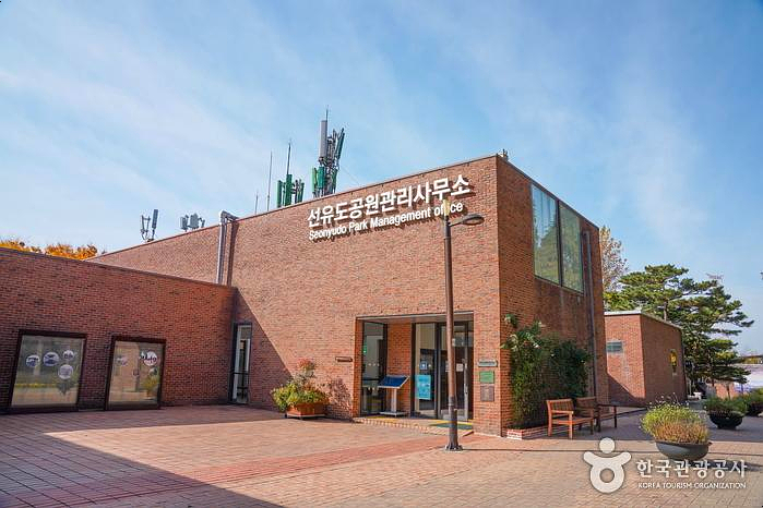 선유도 공원 정문에 들어서면 가장 먼저 관리사무소 건물이 눈에 띕니다. 이 건물은 수조에 모래와 자갈 등을 넣어 불순물을 제거하는 여과지였습니다. 수조가 있던 지하공간은 장애인주차장과 공원관리실이고 여과지 물을 관리하던 지상건물은 방문자 안내소로 사용됩니다.