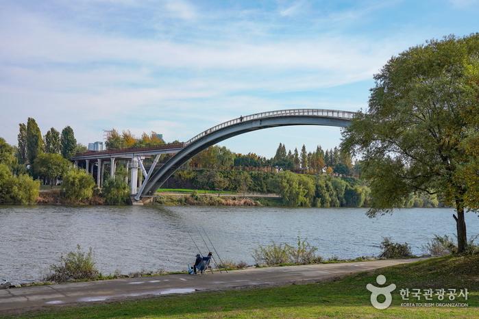 선유도 공원에 들어가는 방법은 두 가지입니다. 지하철이나 버스를 타고 양화대교에서 이어지는 정문을 이용하거나 양화선착장 주변 공영주차장에 차를 세우고 선유교를 건너는 방법입니다. 선유도 남쪽과 양화 한강공원을 잇는 선유교는 서울시와 프랑스가 새천년을 맞는 공동기념사업으로 건설한 보행자 전용 다리입니다. 밤에는 형형색색의 조명이 로맨틱한 분위기를 자아낸다.