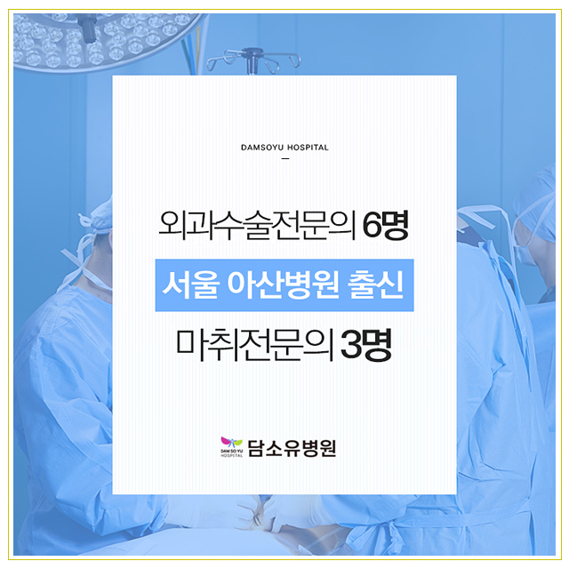 그런 의미에서 저희 병원은 담석증의 통증으로 병원을 찾은 환자들을 위해 좋은 서비스와 의료 환경을 제공하고 있습니다. 현재 외과수술을 담당하고 있는 의료진이 6명이고 서울아산병원 출신 3명의 마취과 의료진이 대기하고 있어 수준 높은 의료서비스를 직접 경험할 수 있습니다.