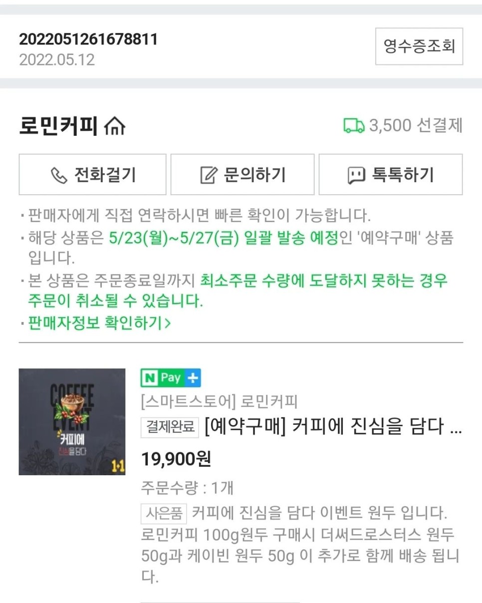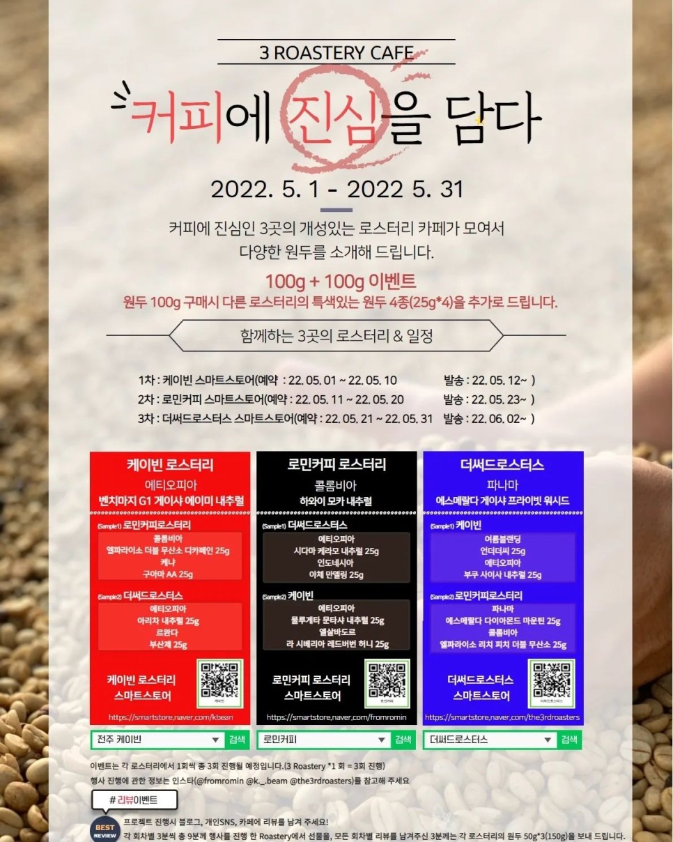 로민 커피 스페셜티 원두 주문 커피에 정성을 담는다.5월 한 달간 전주 로스터리 3곳이 모여 진행하는 원두커피 이벤트. ‘커피에 정성을 담는다’는 원두 100g을 주문하면 다른 로스터리 2곳의 원두커피 4종(25gx4)이 함께 오는 특별한 원두 구매 이벤트다. 지난번 1차 주문한 케이빈 로스터리 커피 원두는 곧 배송시작이다. 인스타그램 피드 창에서 오늘부터는 로민 커피로스터리 예약 주문이 시작된다는 소식을 듣고 빠르게 결제 완료. 포스터에는 원래 어제부터였는데.. ㅎㅎㅎ