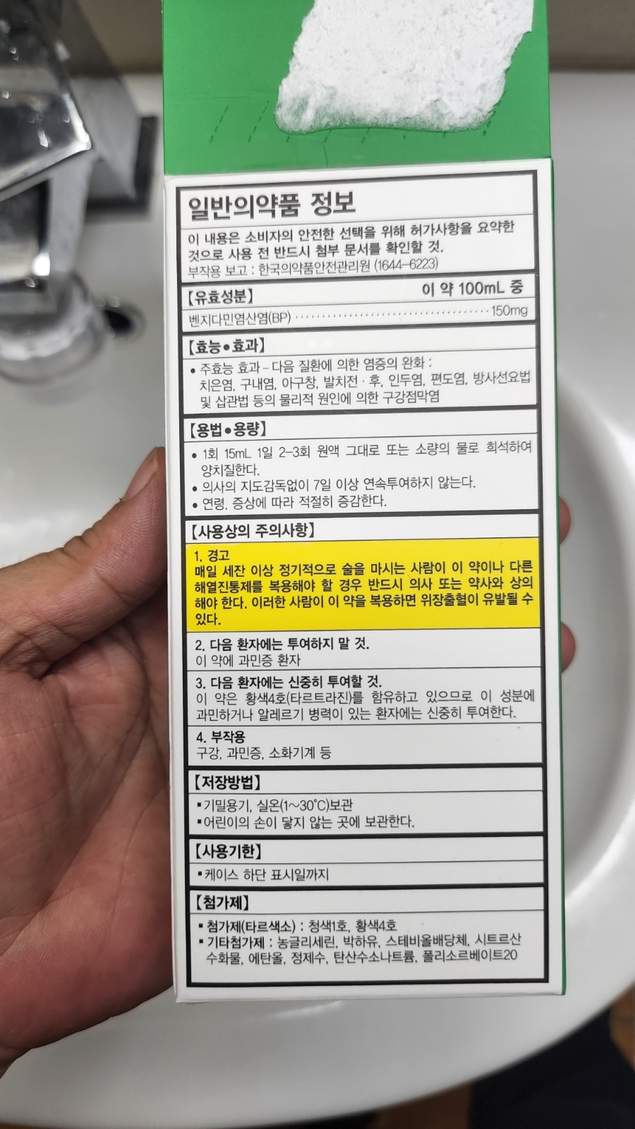 어느새 신종 코로나바이러스 감염증 확진자 격리 6일차, 전체적인 컨디션이 어제보다는 나은 것 같지만 그렇다고 완전히 회복된 것 같지는 않다. 그래도 콧물 증상은 사라졌고 근육통도 눈에 띄게 줄었다. 어제 병원에서 약과 함께 처방받은 파스 가글, 이런 가글이 있는 건 처음 알았는데 효과가 좋아 보인다. 하루 두 번 양치질을 하는데 확실히 편도선의 염증 완화에 도움이 된 것 같다. 물론 처방받은 약의 효과도 있었겠지만. 아, 벤지다민 염산염이라고 적혀있는 걸 이제야 봤어.