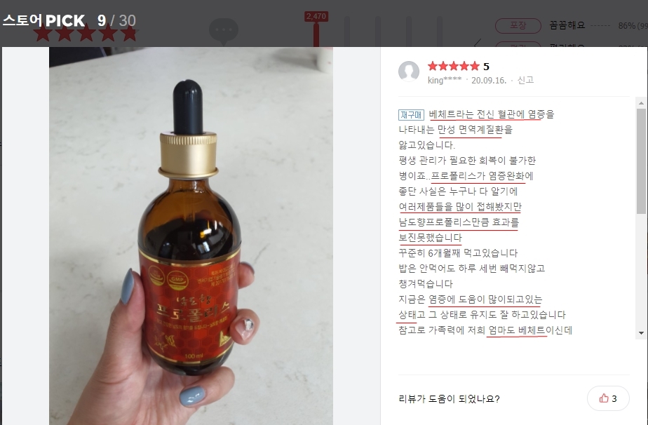 스마트스토어 난도향 프로폴리스 베체트 구내염의 구내궤양 베체트라는 전신혈관에 염증을 보이는 만성 면역계 질환을 앓고 있습니다.평생 관리가 필요한 회복이 불가능한 질병입니다.프로폴리스가 염증 완화에 좋다는 사실은 누구나 알기 때문에 다양한 제품을 많이 접해봤지만 남향 프로폴리스만큼 효과는 없었습니다.꾸준히 6개월째 먹고 있습니다, 밥은 먹지 않아도 1일 3회 빠짐없이 먹고 있습니다.지금은 염증에 도움이 되고 있고, 그대로 유지도 잘 하고 있습니다.