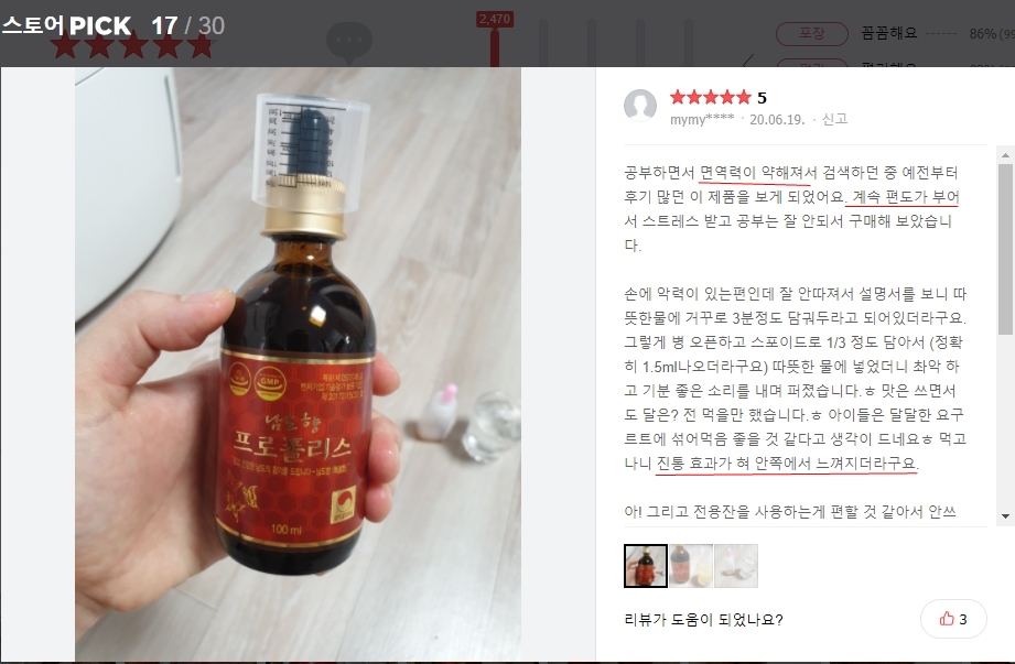 스마트스토어의 남도향 프로폴리스 염증 참고로 가족력에 저희 엄마도 베체트지만 제가 효과를 본 뒤부터는 함께 주문하고 있습니다.엄마는 저보다 더 심한데 2달째 복용중이십니다.입안에 궤양이 생길 때 조금 힘들지만 확실히 빨리 가라앉는다고 하네요.우리는 희석하지 않고 원액으로 마시고 있어요.다른 분들도 꼭 효과가 있을 거라고 생각합니다.참고로 판매자분들도 너무 친절하셔서 더 좋았습니다.^^