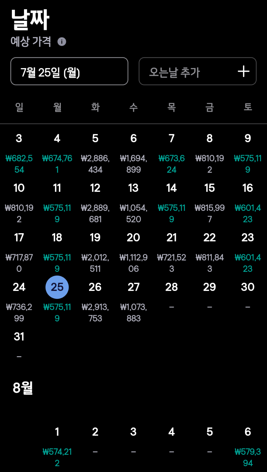그렇게 한국 사이트를 통해 티켓을 사려고 하는데, 아니… 모든 여행 사이트가 매진이라고 합니다.말도 안 되는데? 셔먼에 이렇게 많은 사람들이 가니? 밤을 새워 7월 말~8월 초에 샅샅이 조사해 보았으나 결과는 매진되었습니다.아래는 Skyscanner 앱입니다.여기서 모든 티켓이 구매 불가능했어요.