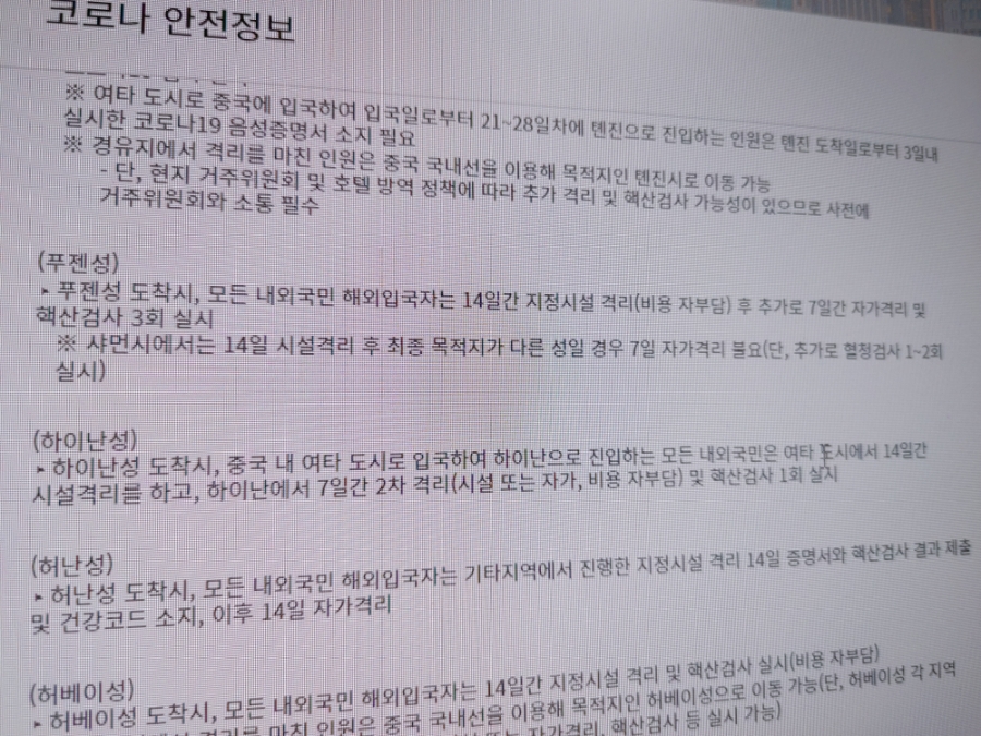 중간에 신종 코로나바이러스 감염증으로 인한 지역별 안내가 나오고 있고, 샤오샤먼이 속한 푸젠성을 보면 14일 호텔 격리+7일 자가격리=총 3주 격리…돈도 엄청 깨질 것 같네.