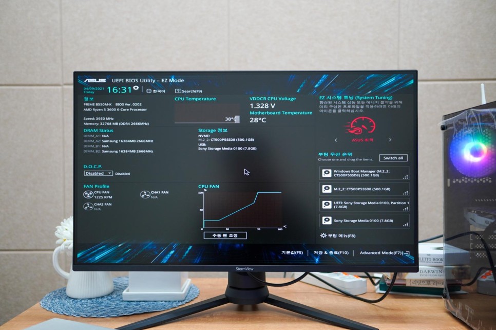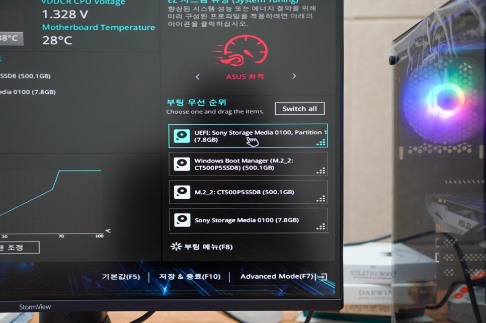 최근에 출시된 메인보드는 마우스를 이용할 수 있어 편합니다. ASUS의 BIOS 초기화면에는 우측 하단에 기동 우선순위가 표시됩니다.