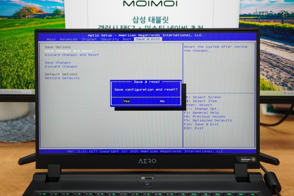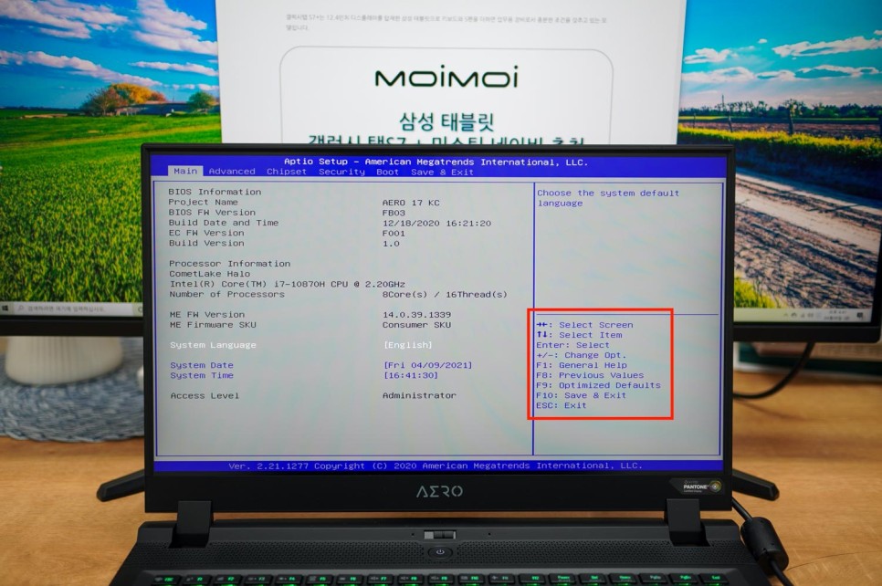 최신제품이지만 기가바이트에서는 마우스를 이용할 수 없습니다. 이 때는 우측 하단의 조작 방법을 참고해 주세요. 간단한 영어 단어로 되어 있기 때문에 이동과 메뉴 선택 방법만 확인하면 됩니다.