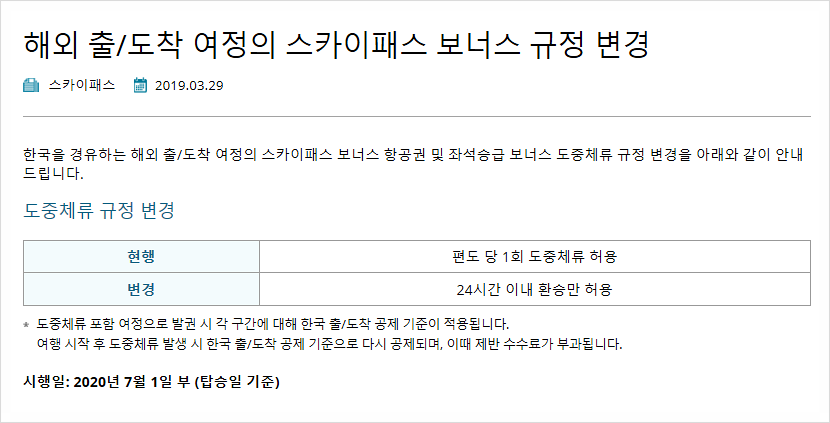 - 대한항공 마일리지를 이용하여 Only 대한항공권 예약 시 허용되었던 편도 스톱오버 불가 – 24시간 체류만 가능 – 탑승일 기준 2020년 7월 1일부터 적용 “예약일 기준 아님”
