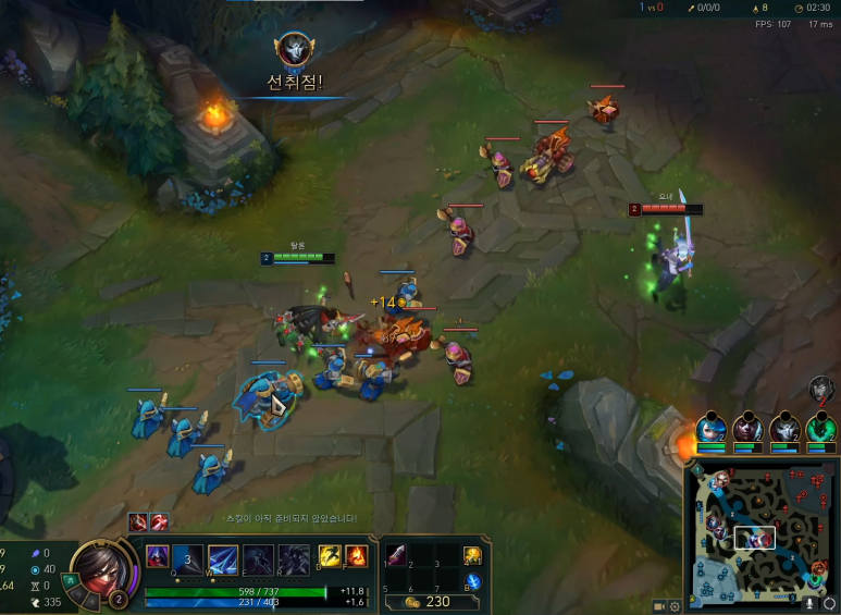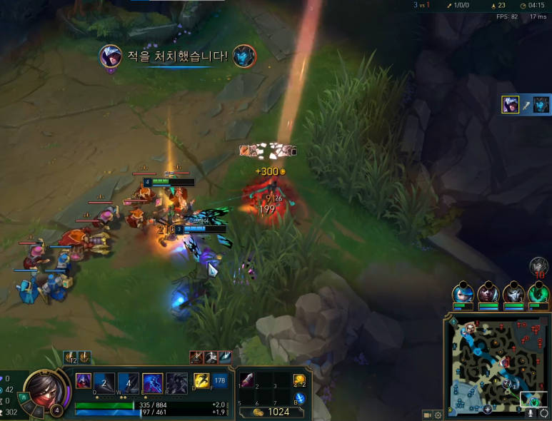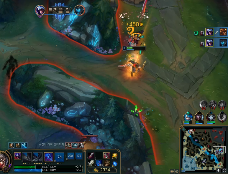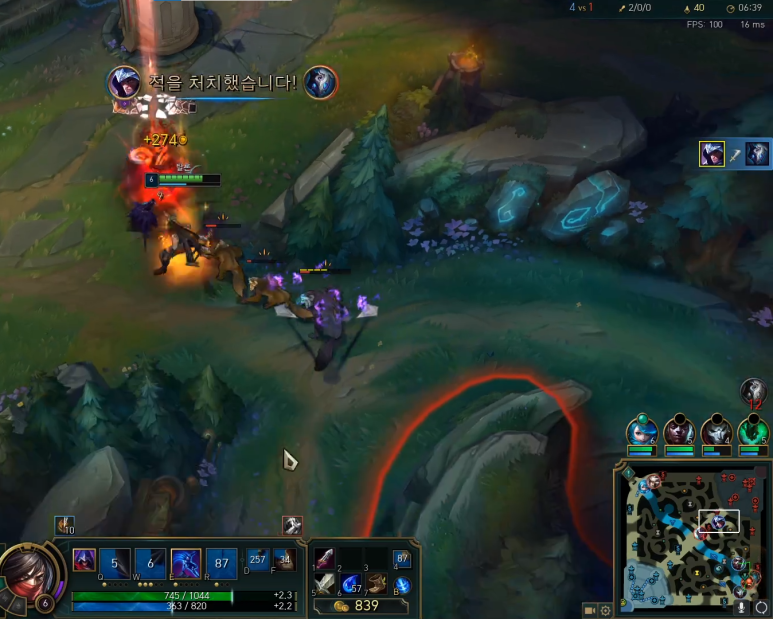 체력이 2500으로 암살자이지만 상당히 높은 모습입니다. 신발을 통해 ad 방어력도 높였습니다.체력이 상당히 높기 때문에 자신 있게 플레이해주는 모습입니다.점멸과 점화도 있기 때문에 가로를 잡고 빠져나와 주었습니다.이대로 쭉 이어서 승리했어요.