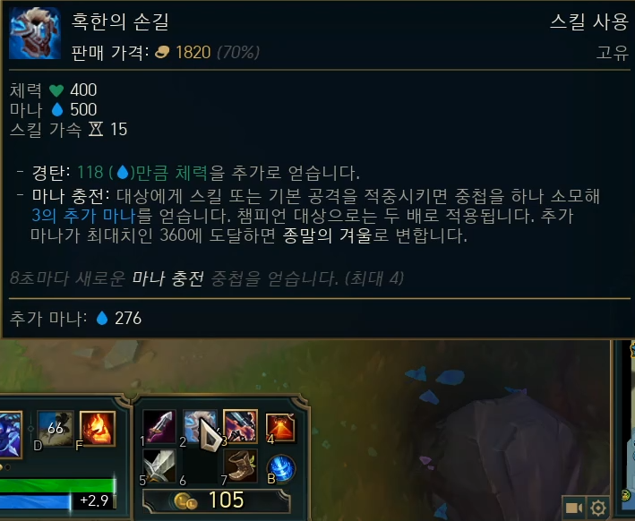 선혈을 1코어로 올리고 2코어에는 원래 세릴다를 올려 부족한 딜링을 보충해 줍니다.딜턴감을확실히주는거죠. 하지만 이번에는 2코어로 혹한의 손을 먼저 들어 주었습니다.그 이유는 사실 한꺼번에 구입해서 구입한 것입니다. 보통 이 아이템은 3코어로 업로드해주세요.단단한 타론의 모습입니다.