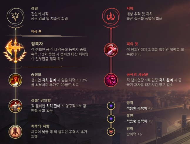 핵심 룬은 정복자를 받아들인 모습입니다. 승전보와 세기, 마지막 저항을 들었어요.사브룬은 지배에서 피의 맛과 궁극의 사냥꾼을 꼽았습니다.실제로 정복자 이외의 룬은 그 판마다 상황에 따라 또는 취향에 따라 물어보세요.이번 소환사 협곡 챔피언들입니다.
