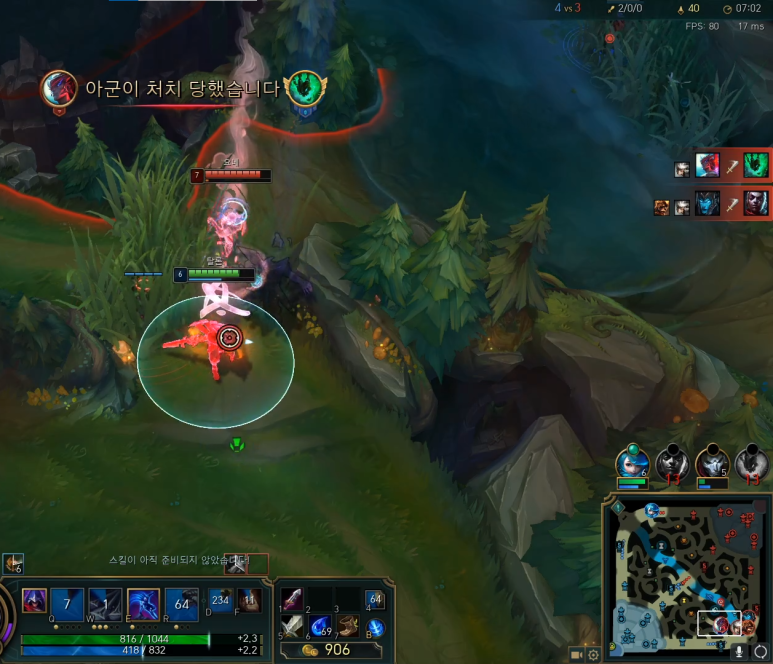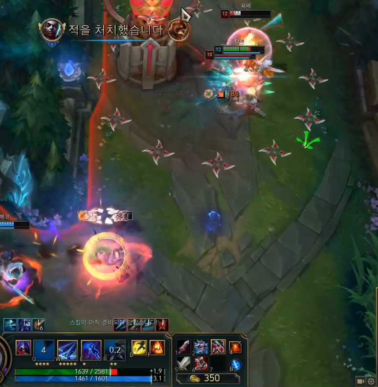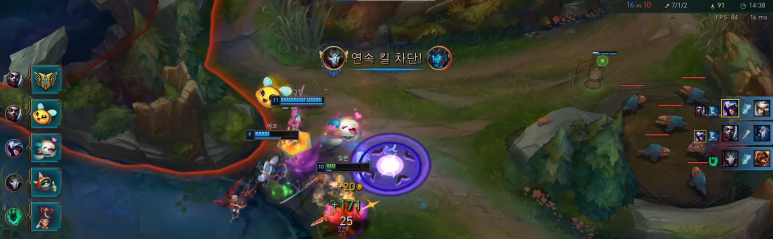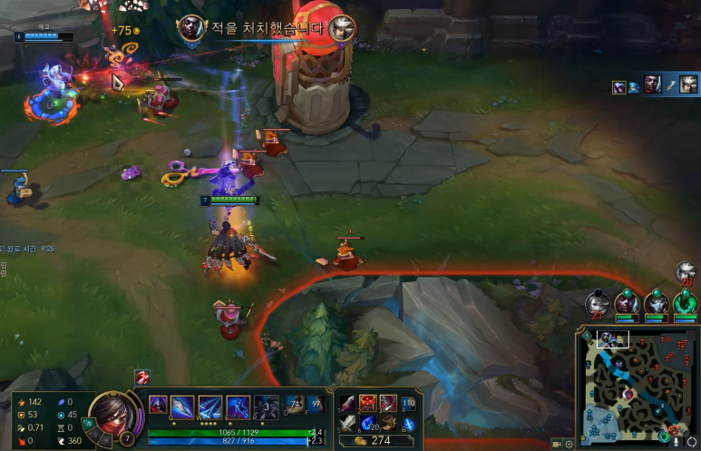 이때 킨드레드의 레벨은 4레벨입니다. 계속 괴롭혀서 킨드레드를 멈춘 상황이에요.뒤늦게 연아가 따라오지만, 타론의 기동력은 절대 따라올 수 없습니다. 안전하게 라인으로 복귀했어요.카밀 텔레포트에서 많이 따라온 상대팀입니다.