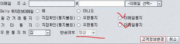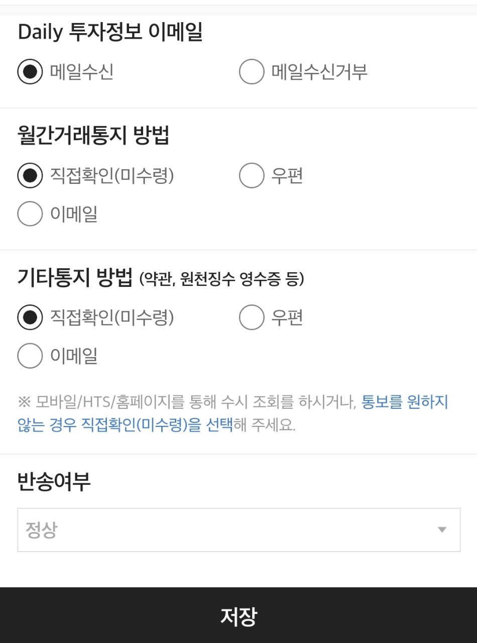 그러면 화면이 나타날 텐데 하단 부분에 문제가 있을 가능성이 높다. 사고 계좌에 등록된 부모 두 명 모두 이 부분이 문제였다. 사실은 이메일 알림으로 체크해놓고 계좌개설을 했는데 이메일 주소가 잘못 기입되어 있었던 것. 대신증권에서 발송되는 이메일을 당연히 확인한 적이 없어 사고 계좌에 등록된 듯했다. 이메일을 올바르게 고쳐 쓰고 반송 여부가 있는 부분을 정상적으로 바꾸면 해결된다.