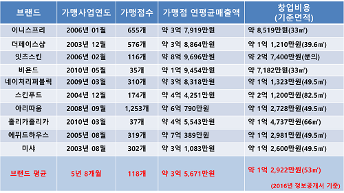 브랜드 가맹점수 가맹점 연평균 매출액(단위:천원) 투쿨포스쿨 23636,554 이니스프리 657268,500 토니모리 484248,692 셀레니크 27244,627 미샤 327227,986 홀리카 홀리카 139217,724 더샘 258207,419 아리따움 651202,904 네이처 리퍼블릭 439163,889 더페이스샵 397112,613 스킨푸드 3993,562