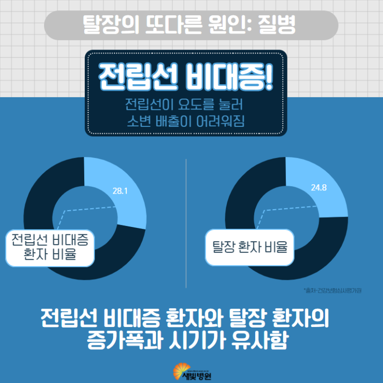 비대해진 전립선이 요도를 누르면 소변을 배출하기 어려운 문제가 생깁니다. 이때 소변을 보기 위해 배에 힘이 많이 들어갑니다. 이로 인해 복벽 압력이 상승하여 탈장 위험이 생깁니다.