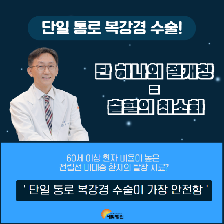 복강경 수술은 흉터의 크기가 작고 통증이 적고 빨리 회복된다는 장점이 있습니다. 가장 큰 복강경 수술의 장점은 국소적으로 필요한 부분에만 접근하기 때문에 출혈이 매우 적다는 것입니다. 따라서 고위험군 환자나 연령대가 높은 분들도 안전하게 수술이 가능합니다.